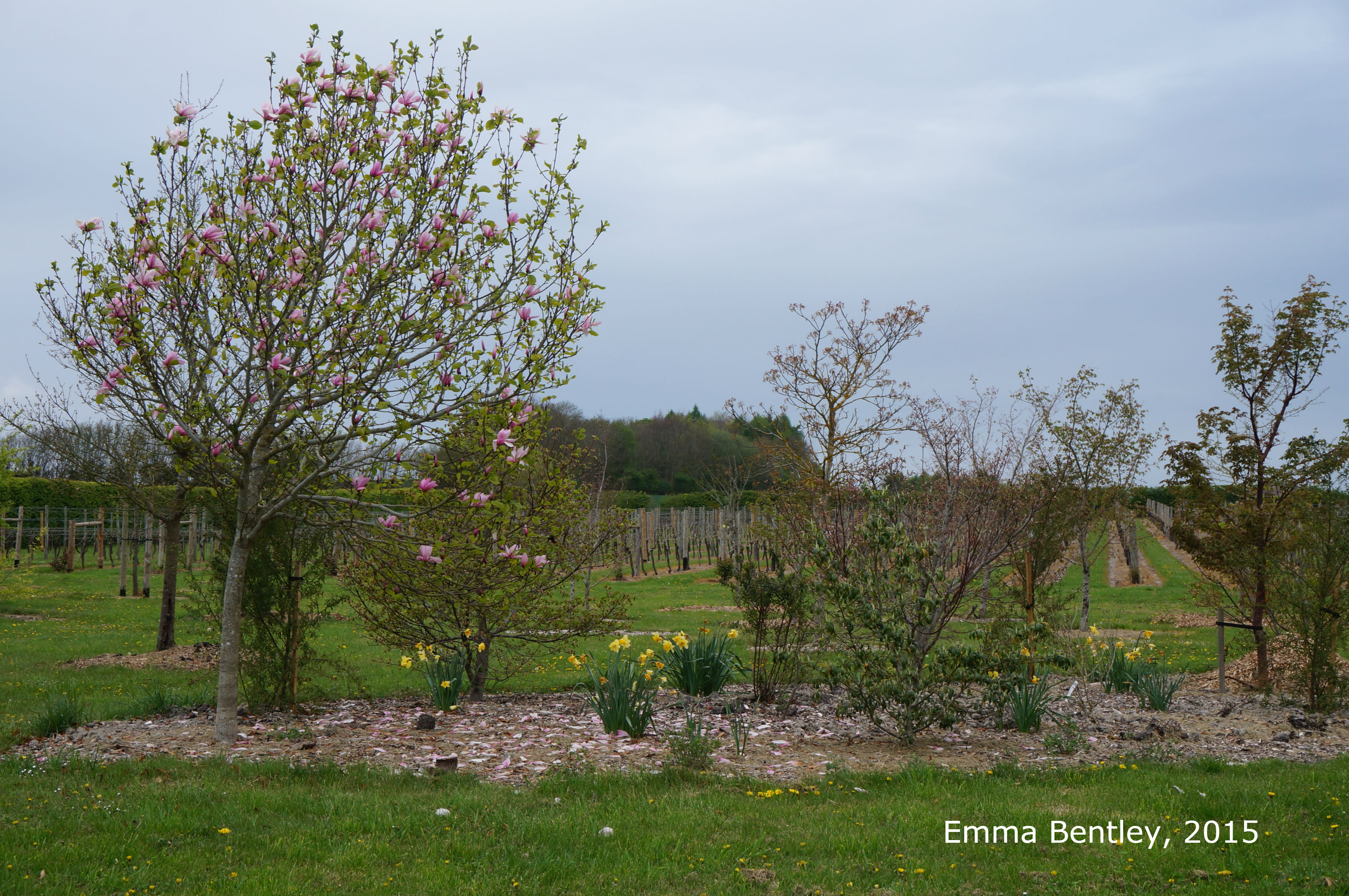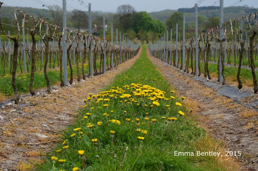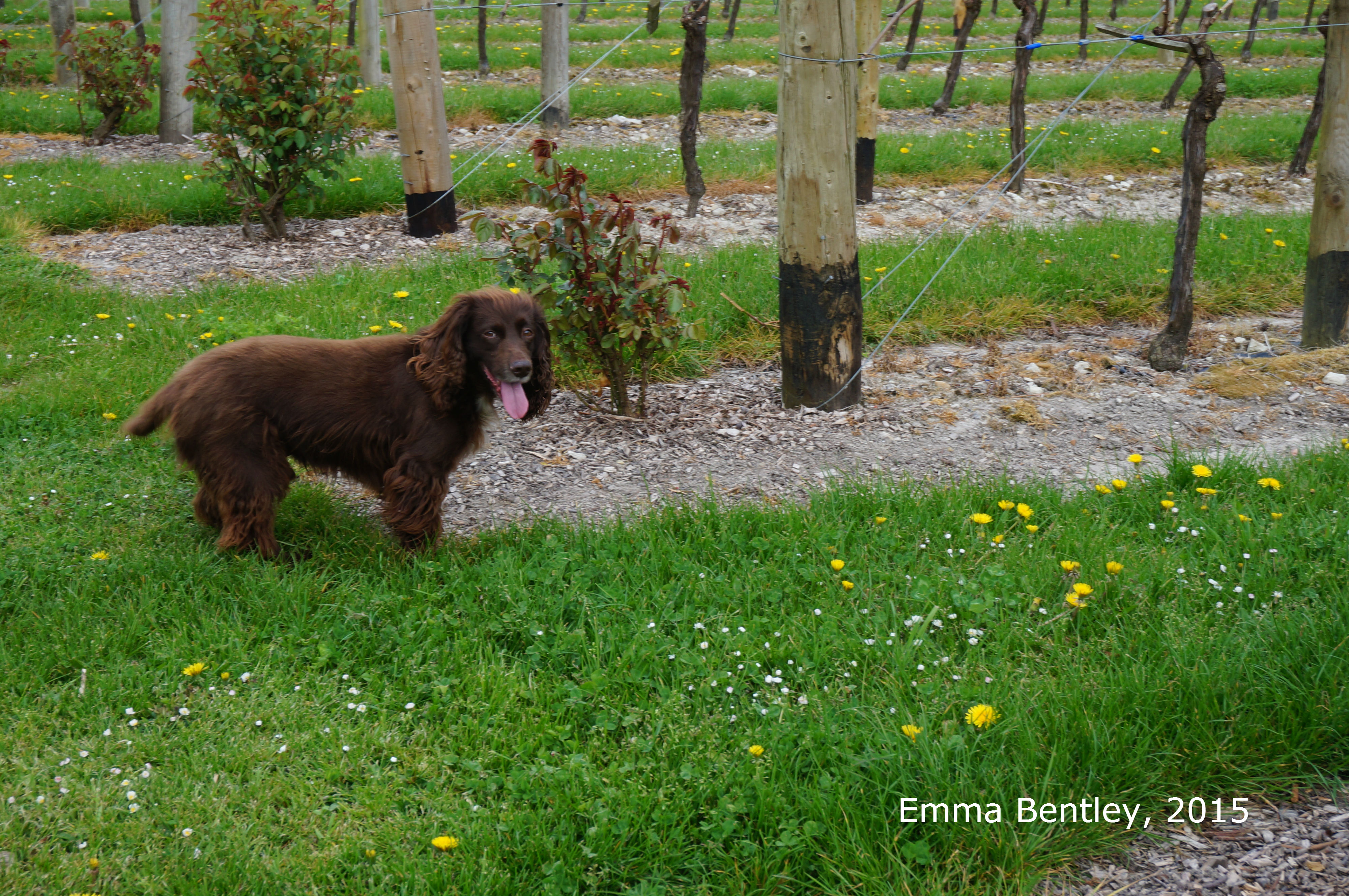 It is a quintessentially English vineyard. Bertie the spaniel runs happily up and down this south-facing, gentle slope. We may be in the North Hampshire Downs, but we’re only at 100m above sea level. There is clover in the centre of the rows for the nitrogen that they bring back to the soil. The vines are spaced 120-150cm apart and trained at 85cm (not dissimilar to Upperton…)