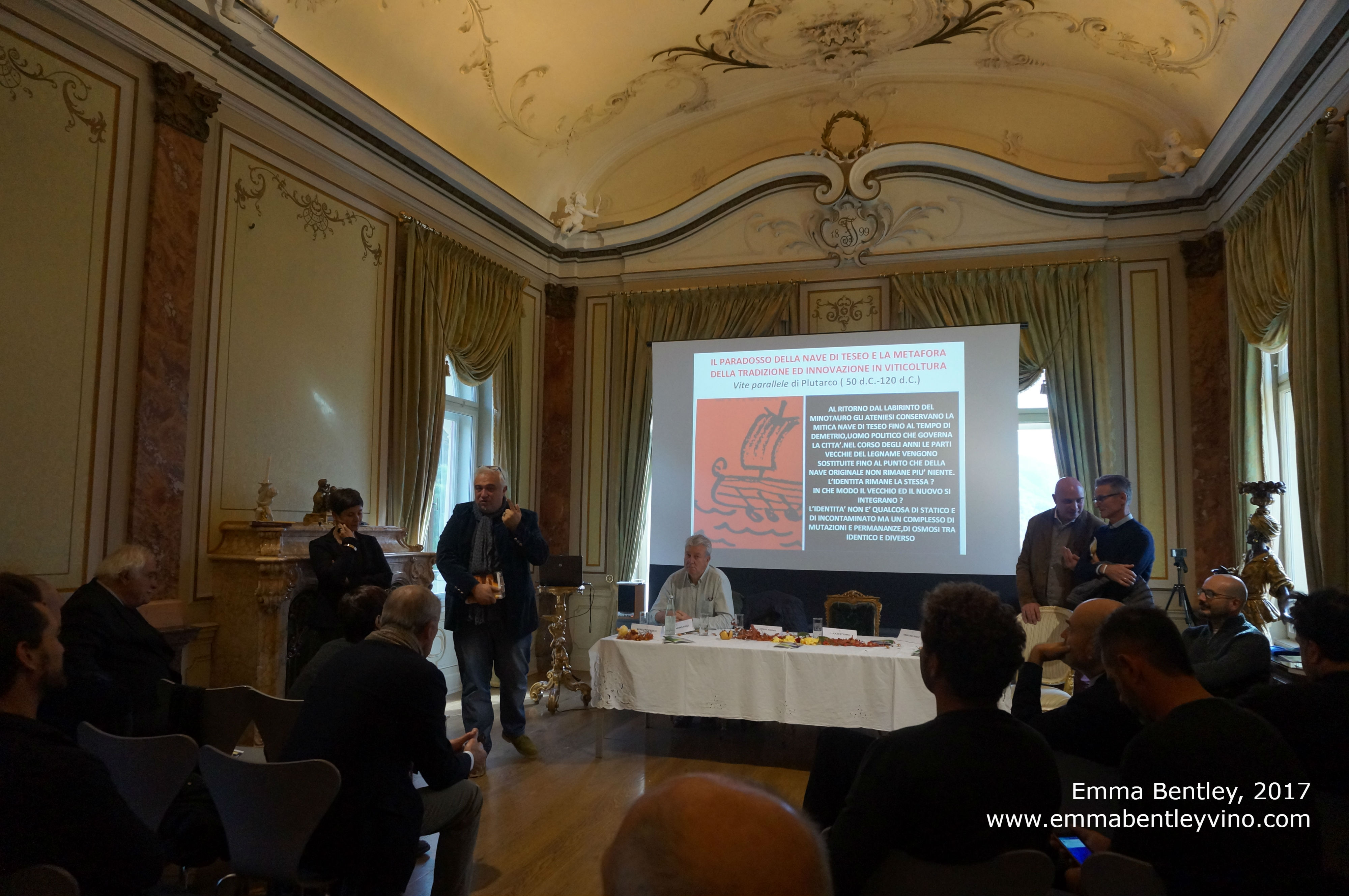 Next up is Luca d’Attoma, an oenologue in his 50s, who explains his belief that “organics is a form of respect between man and his environment.” He quotes some statistics about the rise of organic agriculture in Italy: an increase of 24% between 2015-2016 of certified organic vineyards and a 51% increase in the mass retail sector between 2015-16 in sales of organic produce. Unlike Giorgio before him, he beliefs that organic and biodynamic wines are “more original, authentic and therefore richer” than wines made from conventionally farmed grapes. That said, he acknowledges that the restrictions on organic vinification are too light. For example, 150mg/l of SO2 is allowed in conventional red wines and 100mg/l for organic red wines. He highlights problems with the controllers who certify if a farmer or winemaker is working to organic principles. There are too few controls and far too much disparity in the quality of these controls between the north and south of Italy.