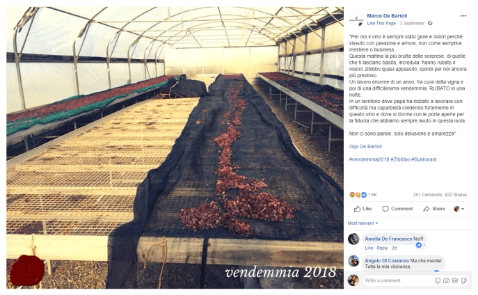 This is a quick translation of their text: “This morning we had the most horrible of surprises, the kind that leaves you just speechless and gobsmacked : someone stole our zibibbo grapes. They had almost finished drying out, and so for us, they were even more precious. The onerous work of a year, tending to the vines and then a very difficult harvest. Stolen in one night…. There are no words, just disappointment and bitterness.”